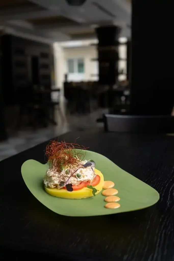 Masa de papa amarilla prensada con lima, rellena de pollo, mayonesa, aguacate y huevo.